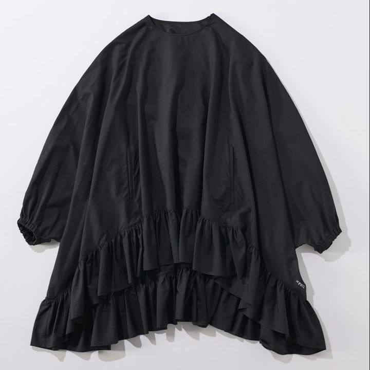 たっぷりの裾フリルが可愛いタフタ素材のライトポンチョ。機能性もバッチリでヒップも隠れる長めの丈感が嬉しいポイント。普段のおしゃれコーデにはもちろん、運動後にもサッとかぶるだけで一気に可愛く決まる!忙しい日にも頼れる優秀アイテムです。