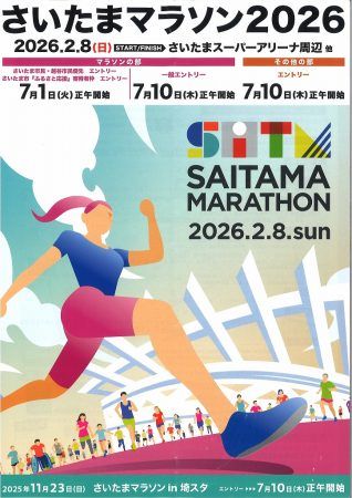 「さいたまマラソン2026」が、2026年2/8(日)、さいたま新都心駅周辺をメイン会場に開催されます。 マラソンの部(18歳以上)は、さいたま市民優先エントリーが、7/1(火)正午から始まります。 一般エントリーは7/10(木)正午から。 詳細やエントリーは大会公式HPで確認を。