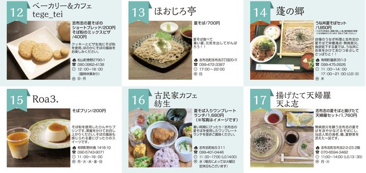 生協コープかごしま、Aコープ鹿児島など、鹿児島県内の主要スーパーや、志布志市内の飲食店17店舗で提供されます。うなぎの駅の「鰻そば重 いなりセット」 や、Cafe&Barロコランドの「そば粉が転生したらガレットだった件」、ベーカリー&カフェ tege_teiの「志布志の夏そばのショートブレッド」 など、お店によって工夫を凝らしたメニューにも注目です!