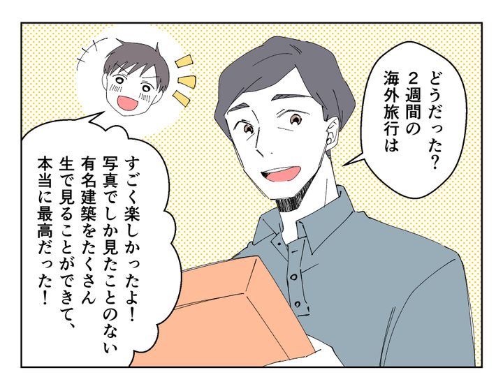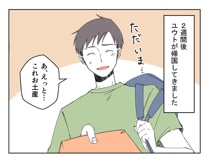 ユキコさんが「帰国したらすぐに実家に来て説明すること」と事前にメッセージをおくっていたこともあり、ユウトさんは帰ってすぐ、実家にお土産を持って説明しにきたそうです。旦那さんは気まずい顔をして玄関から入ってきたユウトさんを気遣い、和やかにユウトさんに話しかけます。そのうちユウトさんも気まずい空気は一旦忘れ、楽しかった海外旅行について、土産話に花を咲かせます。しかし、そんななか、ユキコさんは1人重苦しい空気を放ちます。