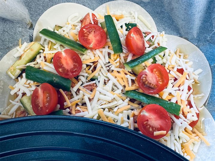 5. チーズが溶け、ミニトマトが少ししんなりしたらフタを外して強火にし、餃子の皮をパリッと焼き上げる。