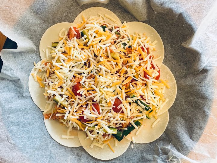 3. フライパンに餃子の皮を並べる。2以外の[A]の具材を混ぜ合わせ、餃子の皮の上全体にのせ、チーズを散らす。