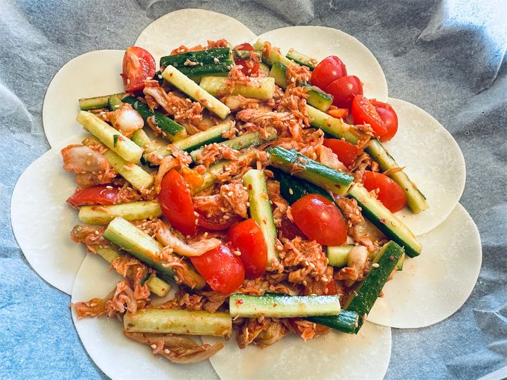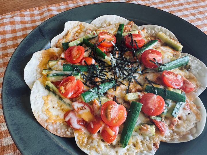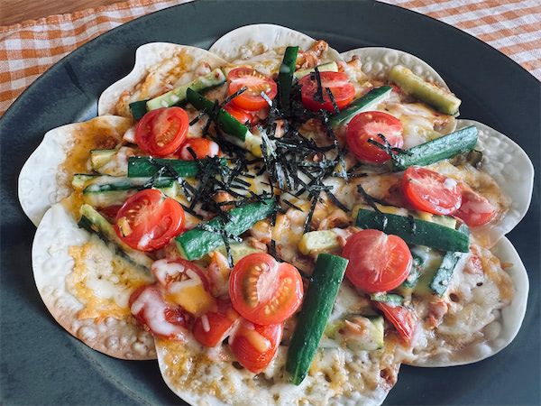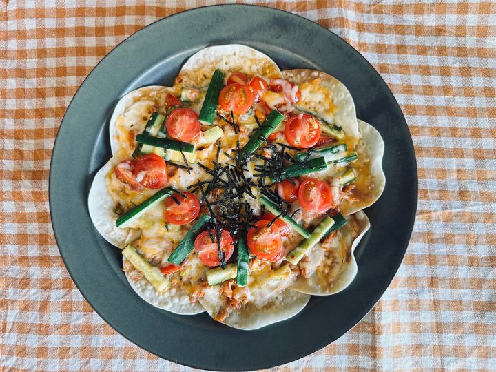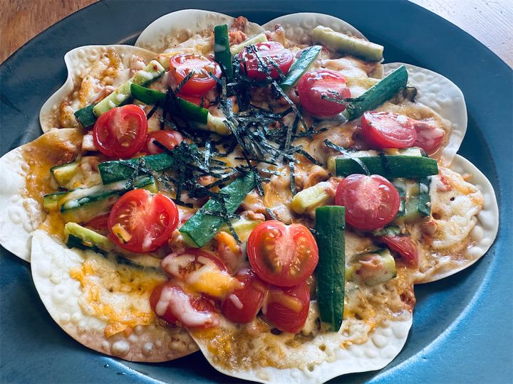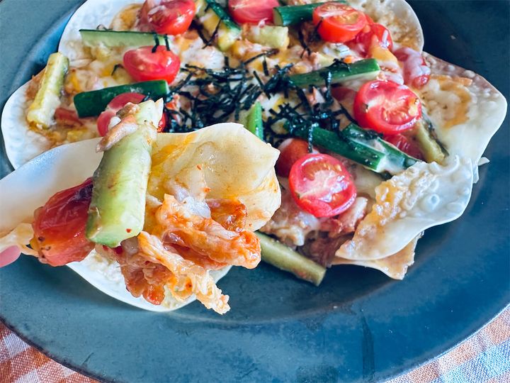 生地も具材も変化球な「きゅうりとキムチのヘルシーピザ」。餃子の皮が余ったらぜひ作ってみてくださいね。