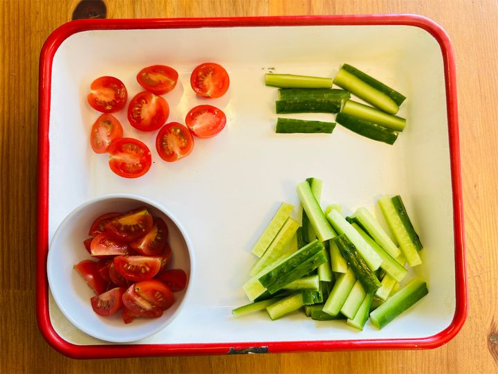 1. きゅうりは拍子木切りにし、ミニトマトは4個を四つ切り、4個を二つ切りにする。