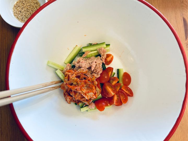 それに、キムチとツナの相性もいいですね〜。ゴマ油をたらしたので、風味も良く食欲をそそります。