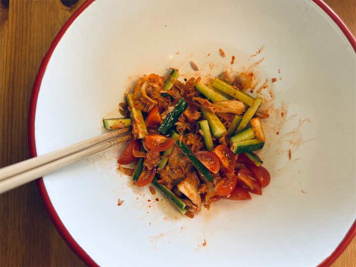 きゅうりの緑とキムチの赤で、彩りもきれい。では、さっそくいただきます!