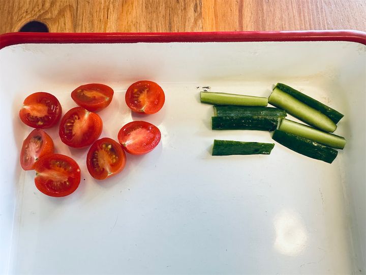 拍子木切りにしたきゅうり8本(皮が見える部分)と二つ切りにしたミニトマトを4個を取り分けておく。