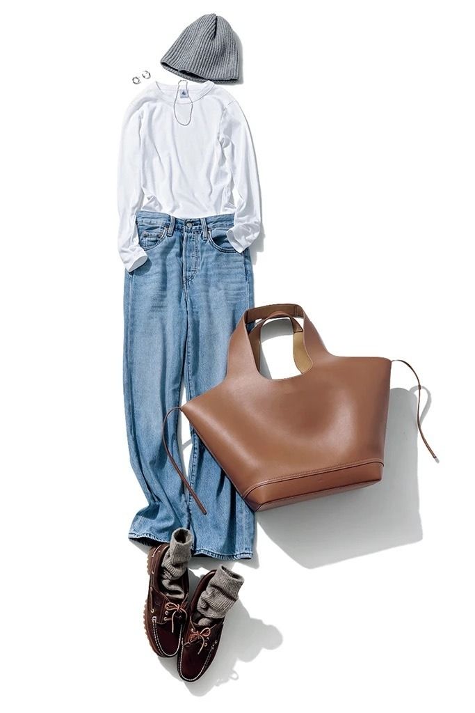 「白Tとライトブルーのデニムには、ニット帽や厚手のソックスを散らしてぬくもりをキープ。究極にシンプルなので、トゥーマッチなサイズのレザーバッグを添えて、さっぱりとした印象を解消。服は春夏・小物は秋冬、というように季節感に差をつけるだけで、淡い服の配色や薄着の軽さを上手に補ってバランスよく」(高木さん)