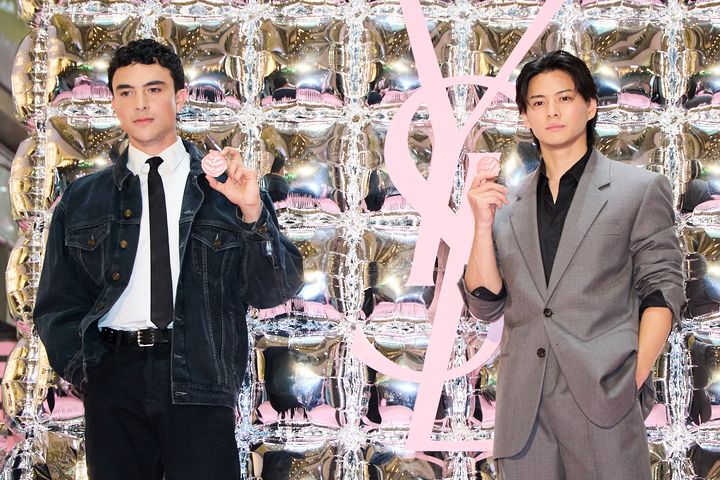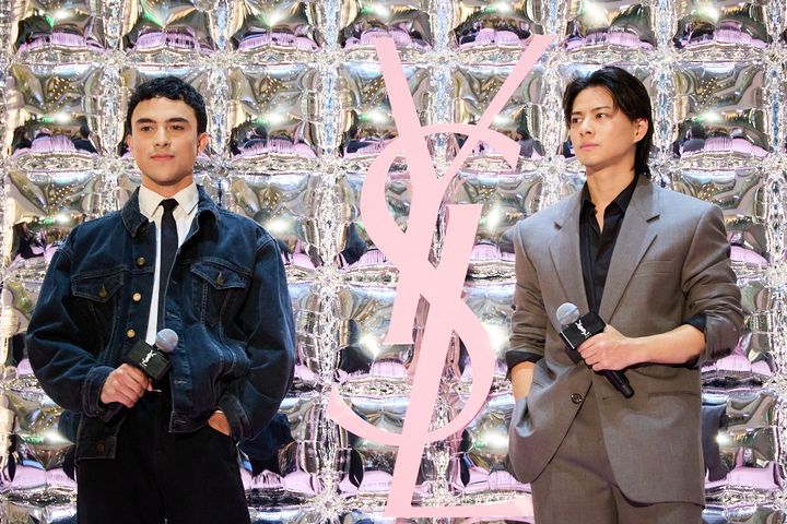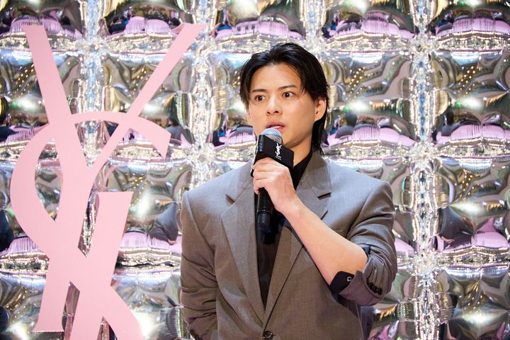 平野さんはグレーのスーツ姿にセンターパートのヘアスタイルで登場。精悍さと余裕を醸した表情でステージに上がると、同ブランドのグローバル メークアップ アーティストのサム・ヴィッサーさんと親愛の抱擁を交わしました。今日サムさんが平野さんに施したメークのポイントは人気商品「YSL メイクミーブラッシュ パウダー No.44 ヌード ラヴァリエール」。サムさん曰く、「紫耀さんの美しい顔にピッタリ。ただ色づくだけではなく、運動した後のようなほんのり上気した、セクシーな装いになります」とアイテムについて紹介。それを受け、平野さんは「魔法のようなチーク。サッと塗っていただいたあと鏡を見たら、メリハリのある健康的な印象になりました」と感服しきりでした。