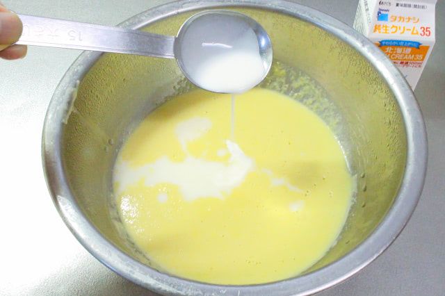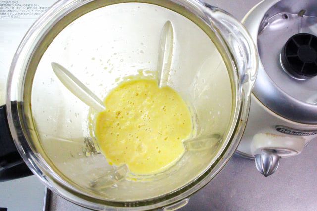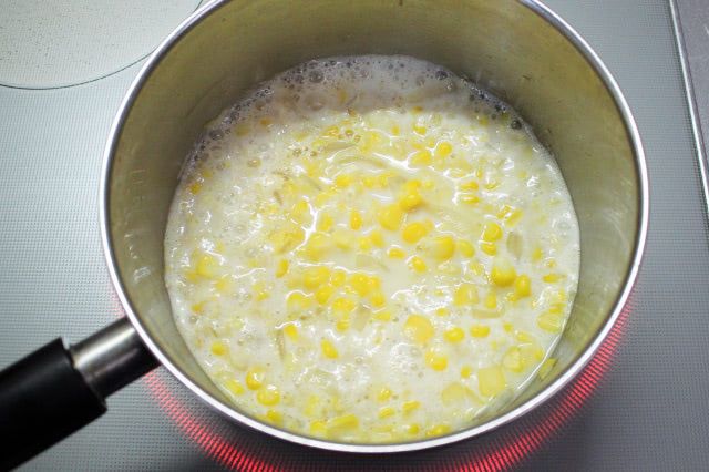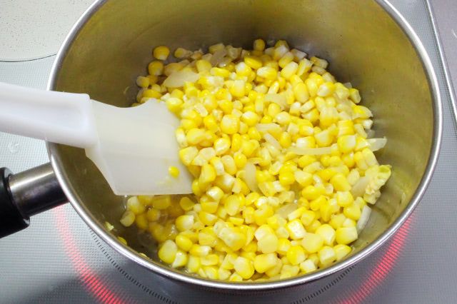 生のとうもろこしはもちろん、缶詰のスイートコーンと汁も使います。今回は缶詰の汁を全量(30ml)使い、足りない分を水(10ml)で補いました。