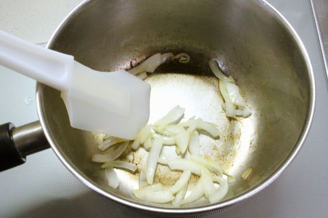 2. 鍋にバターを入れ、弱火にかけて溶かします。1の玉ねぎを入れ、塩とこしょうを軽く振って、透き通るまで炒めます。