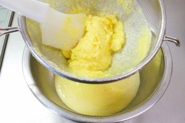 裏ごしして、とうもろこしの薄皮などを取り除きます。このひと手間がホテルのスープという感じです。濾した後はザルの上に薄皮がたくさん残りました。