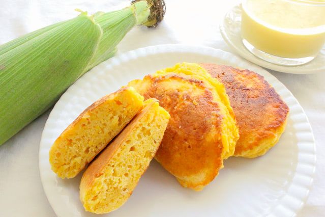 こちらが、筆者オリジナルレシピで作った「コーンパンケーキ」です。とうもろこしの繊維に水分が含まれていたので、牛乳を加えませんでしたが、ふっくらと黄色っぽく焼けましたよ。