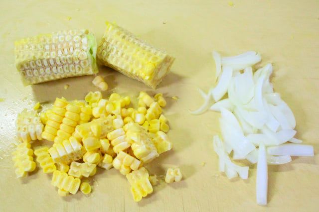 1. とうもろこしを芯から外し、玉ねぎを薄切りにします。