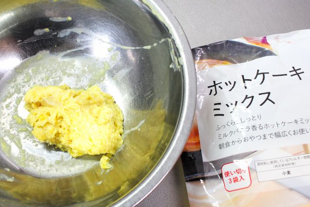 スープを裏ごしした時に出た、薄皮などの繊維。計量してみると60gほどありました。そのまま食べても甘い味わいが残っていましたが、口に残るので、ホットケーキミックスと混ぜ、自己流でパンケーキに仕立てることに。
