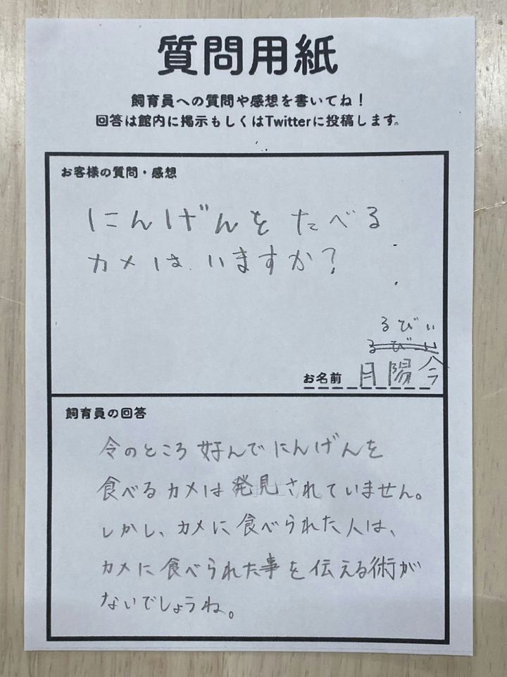 動物園や水族館で、飼育員さんへの質問が書ける紙が置いてあることありますよね。道の駅ウミガメ公園の質問コーナーへ、ある質問が届きます。飼育員さんの回答がこちら。