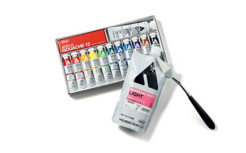 右から・ペンチングナイフ¥3,355、アクリル絵具下地材¥1,320、アクリリック ガッシュマスターセット¥3,850/以上ホルベイン画材