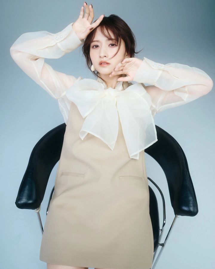今季はずせないミニドレスも大きなリボンのブラウスで淑女のような品格を。