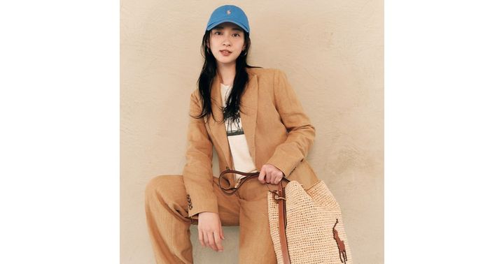ラルフのハンサムなセットアップをキャップやビッグサイズの夏素材のバッグでリラクシーに着こなす武井咲さん