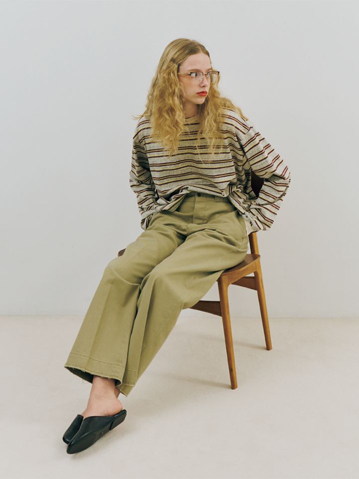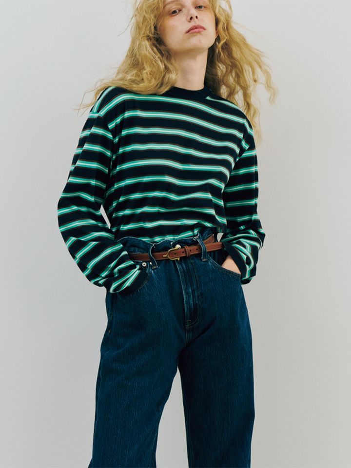 ネイビー地にブルー、よく見ると白やブラウンも入った奥行きのあるボーダー。大きめデニムのウエストをベルトで締めて生まれるニュアンスで、ただのラフで終わらせない。