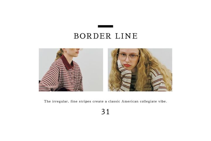 定番のボーダーにはマリンのイメージがあるのに対して、ランダムボーダーは細いピッチを不規則に繰り返すことで、古きよきアメリカンカレッジムードが漂う。落ち着いた色がベースなら、手持ちのワードローブとも好相性。