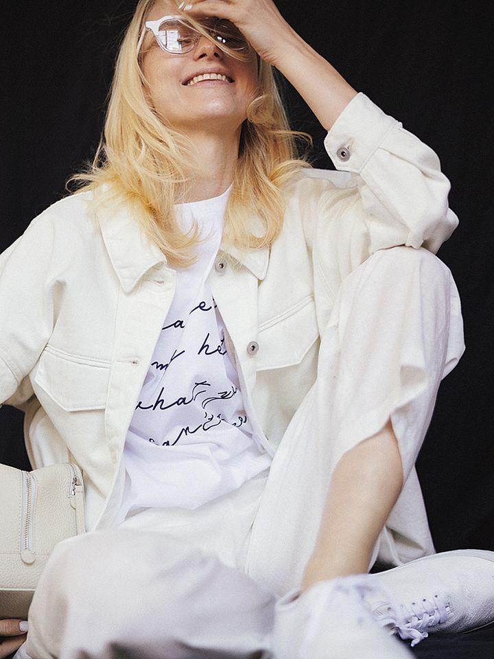 シャープすぎも甘すぎもしない曲線的なドローリングが、白のやさしげな印象をくずさずコーディネートを引き締める。生成りのようなシャツやベージュのようなバッグなど、色合いに差をつけてオール白をリズムよく。