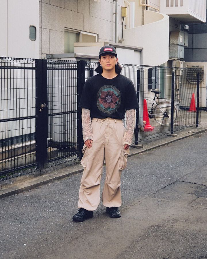 本日の着こなしのポイント:ストリート感のあるサイズ感でトップスのレイヤードがポイント。