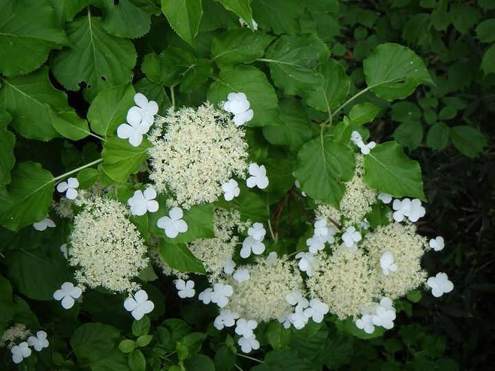 ちなみにアジサイの花は真ん中のふわふわした部分で、花に見える額片は「飾り花」とも呼ばれ、虫を集めるためのものです。そしてそこがツルアジサイとイワガラミを見分けるポイントにもなっています。