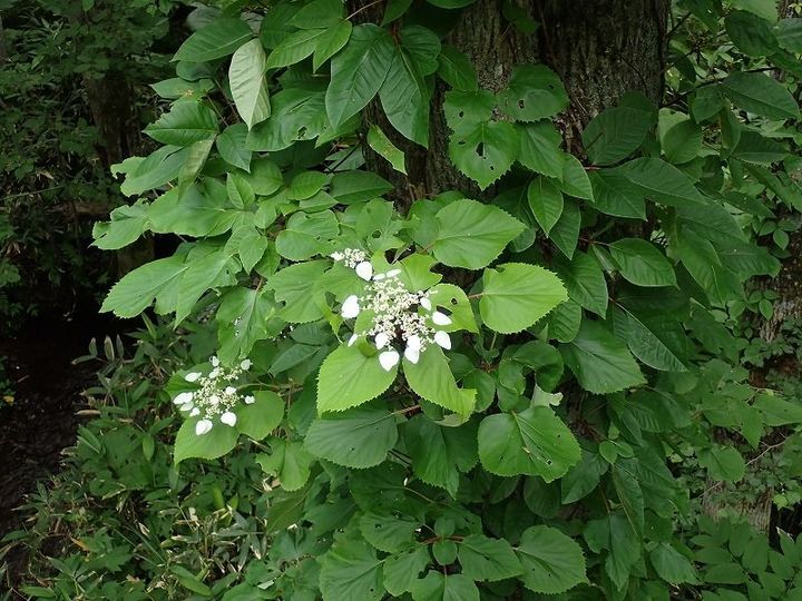 その名の通り、ツルになっているアジサイで、ヤチダモなどのまっすぐに伸びた木に巻き付いて成長していきます。満開になると森の中に白い柱ができあがり遠くからでもよくわかります。