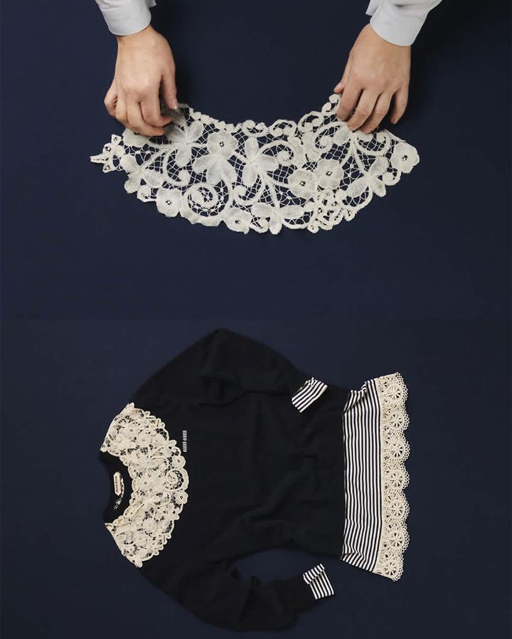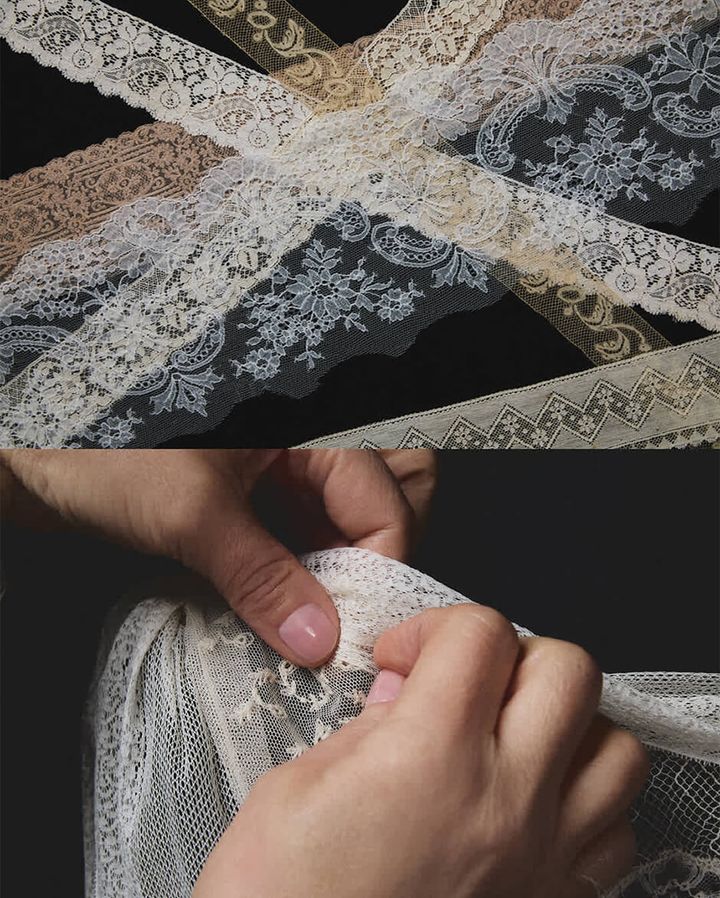 ストライプリボンやカスタムクレストを配したジャケット、アンティークレースや解体したTシャツを用いたガウンは、枠にとらわれず、過去の繊細な記憶を昇華する。
