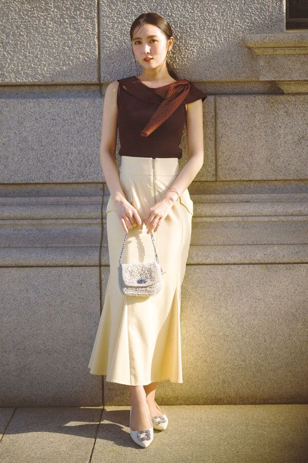 ニット¥8,690/31 Sons de mode(ダブルエー) スカート¥15,400/Noëla ピアス¥18,700/バルブス(ズットホリック) バングル¥11,990/チビ・ジュエルズ(チビジュエルズ・ジャパン) バッグ¥47,300/アンテプリマ/ワイヤーバッグ(アンテプリマジャパン) パンプス¥3,490/神戸レタス