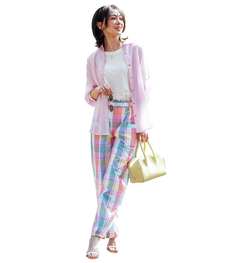 シャツ¥8,990(PLST)Tシャツ¥9,900(コンテ/コンテ 青山店)パンツ¥36,300(ヴィドゥヴィンスター/THIRD MAGAZINE)バッグ¥53,900(ヴァジック/ヴァジックジャパン)靴¥64,900(ネブローニ)サングラス¥50,600(アイヴァン/アイヴァン 東京ギャラリー)ピアス¥40,700ネックレス¥19,800リング¥808,500(すべてマリハ)