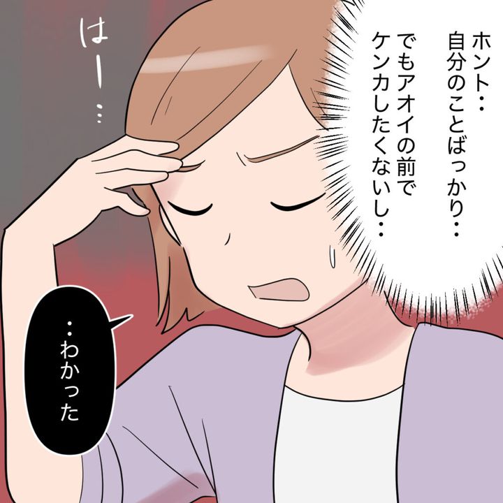自分は友達と楽しむのに、私とアオイが夫抜きで楽しむことが気に入らない夫・・。「ホント・・自分のことばっかり・・。でもアオイの前でケンカしたくないし・・」私は夫の身勝手さに怒りを感じつつも何を言っても通じないと諦め「・・わかった」と答えました。