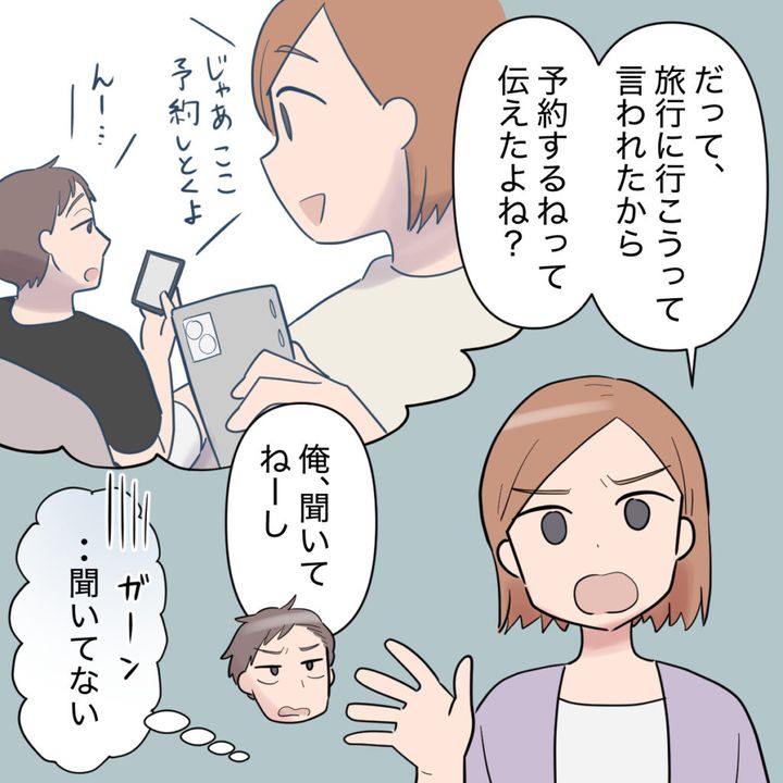 「だって、旅行に行こうって言われたから。予約するねって伝えたよね?」と答えると、夫は怒ったように「俺、聞いてねーし」と一言。私は確かに行き先や宿泊先を夫に伝えて「じゃあここ予約しとくよ」と言ってから予約したのですが、そういえばそのとき夫は振り向きもせずスマホを見たまま「んー・・」と空返事だったような気がします。私の話を聞いてなかったんだ・・とショックを受けていると、