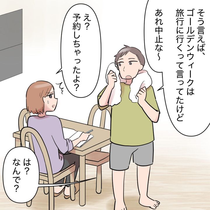 自分中心な夫にうんざりしていたある日、お風呂上がりの夫が「そういえば、ゴールデンウィークは旅行に行くって言ってたけど、あれ中止な~」と軽い感じで言ってきました。「え?予約しちゃったよ?」私が驚いてそう言うと、夫は「は?なんで?」と不機嫌そうに言いました。