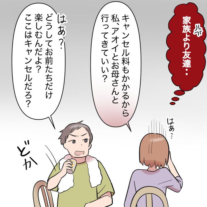 後から誘われた友達との集まりを理由に家族旅行をあっさり中止にする夫に「家族より友達・・」と失望しつつ、気を取り直して「キャンセル料もかかるから、私、アオイとお母さんと行ってきていい?」と夫の代わりに母を誘って旅行の予定はそのまま継続しようと思ったのですが、夫は「はぁ?どうしてお前たちだけ楽しむんだよ?ここはキャンセルだろ?」と不満を口にしました。