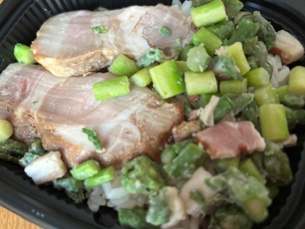 甘~いアスパラにやわらかくジューシーなルスツ豚味噌漬けの混ぜご飯。キャベツのマリネも美味。旬の手の込んだお弁当♪ミニ弁当ですが大満足!しかも!!