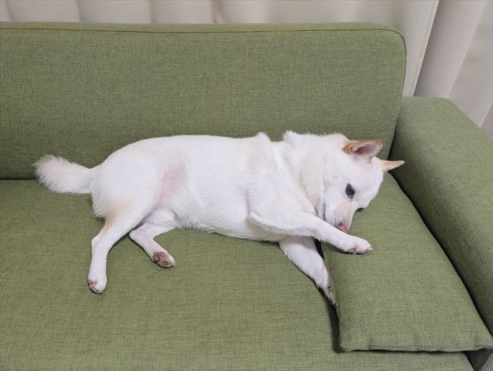 ソファの上で横になっているのは、白柴の『まんまる』くん。 クッションに頭を乗せていますが、そのクッションの角度を両方のおててで細かな調整を入れています。