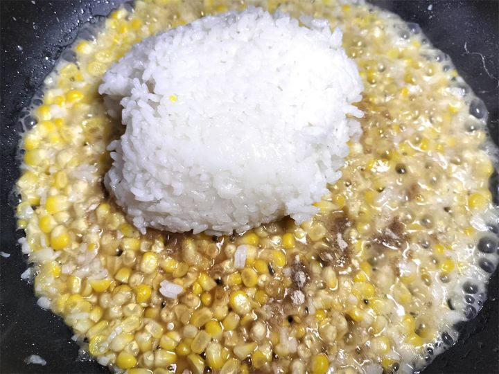 7. 2の炊き上がったご飯を入れて、6のとうもろこしと炒め合わせます。