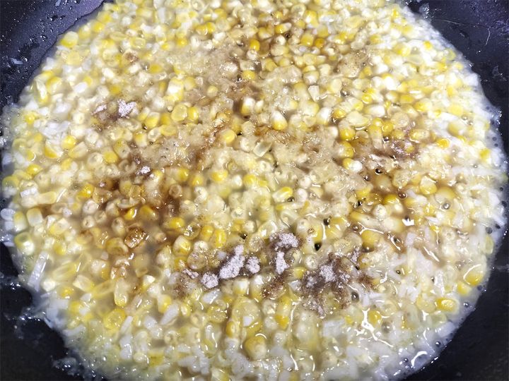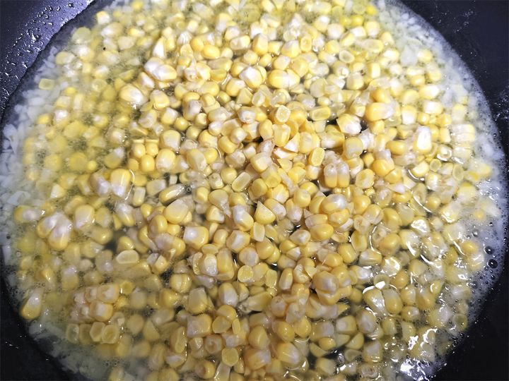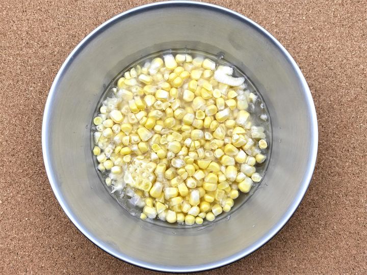 5. バターが泡立ってきたらとうもろこしを水ごと入れ、軽く混ぜたらフタをして強火で1分半~2分煮ます。
