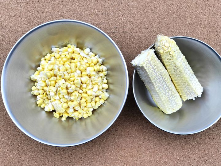 とうもろこしは包丁でそぐと、どうしても芯に胚芽の部分が残ってしまいます。実は胚芽にはリノール酸、ビタミンB、食物繊維、鉄分、亜鉛といった栄養素が一番多く含まれていますので、そのまま捨ててしまってはもったいないのです。この甘くておいしい部分を米と一緒に炊くという調理法はわたしも以前からやっていますが、米に旨味が移ってとてもおいしくなります。捨てる部分を利用しておいしくなるのですから、やった方がいいですよね。
