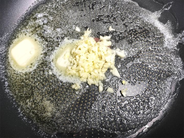 4. フライパンにバターを溶かし、にんにくを入れて弱火で炒めます。