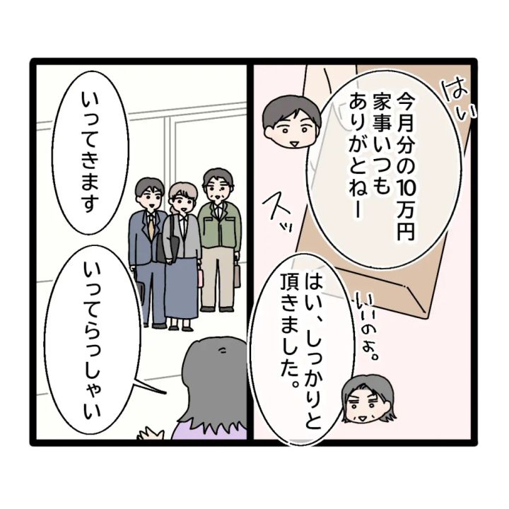 「はい。今月分の10万円。家事いつもありがとねー」そう言って伸介が封筒を差し出すと、「いいのよ。はい、しっかりといただきました」そう言って義母が封筒を受け取りました。