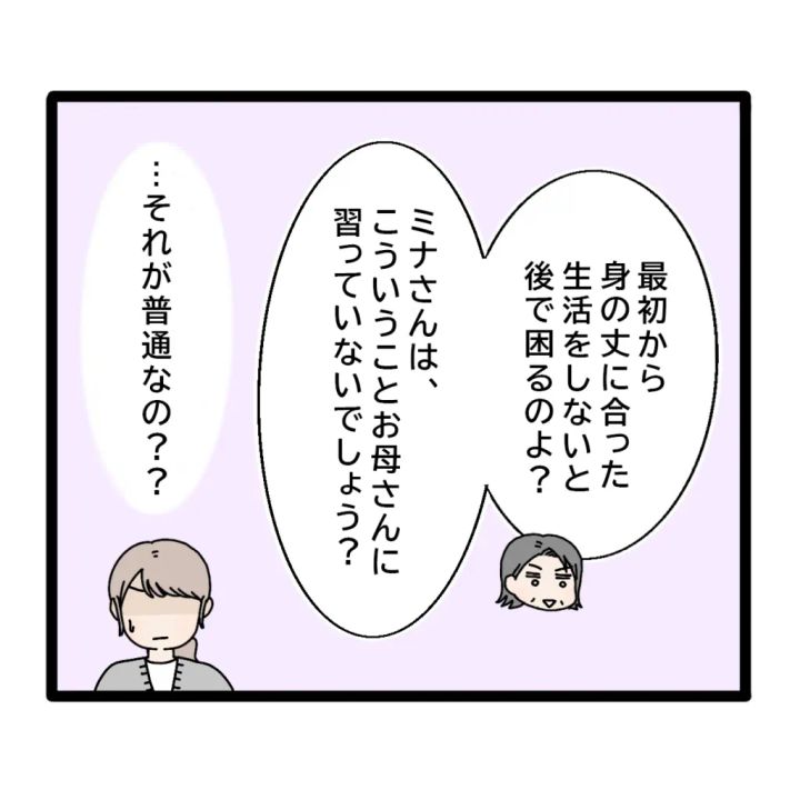 「最初から身の丈に合った生活をしないと後で困るのよ?ミナさんは、こういうことお母さんに習っていないでしょう?」そう言われ、「・・それが普通なの??」と疑問だらけ。