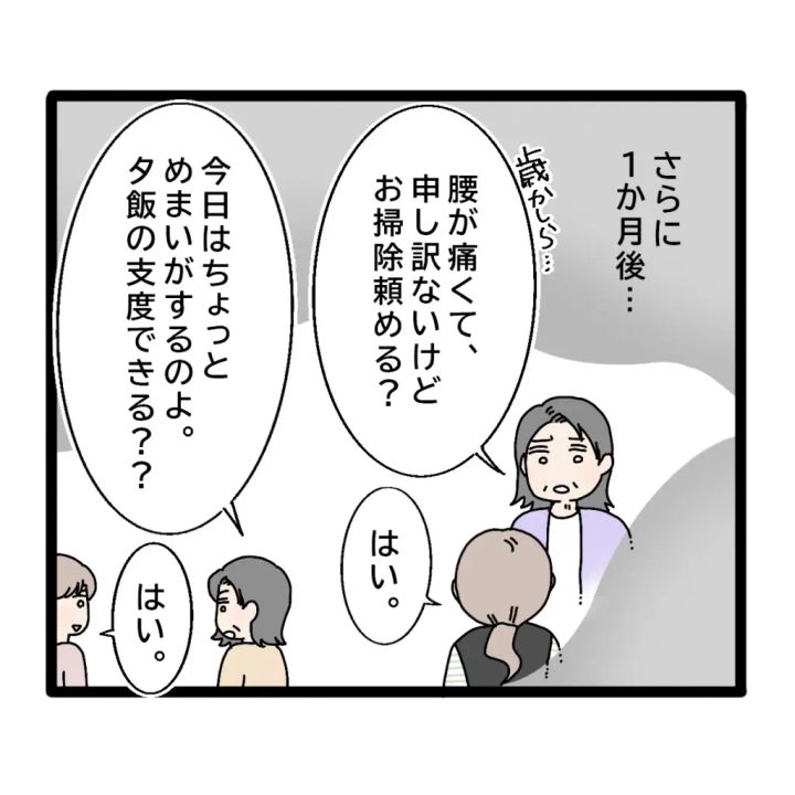 「歳かしら・・腰が痛くて、申し訳ないけどお掃除頼める?」そう言われ、「はい」と返事をして掃除をし、またある時には「今日はちょっとめまいがするのよ。夕飯の支度できる??」と言われ、やっぱり「はい」と返事をして夕飯を作る。そんな日が増えていきました。