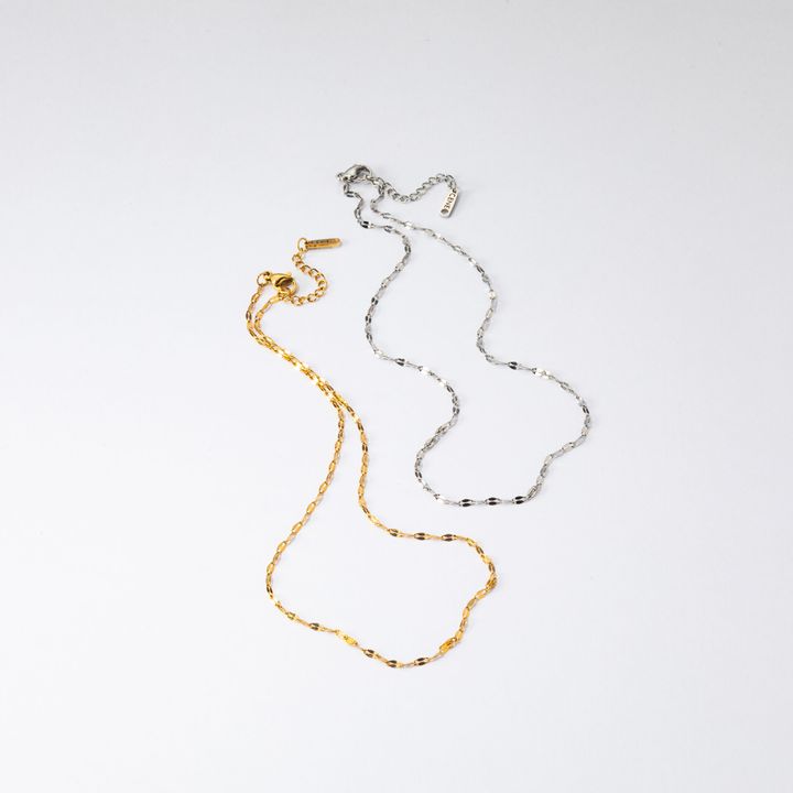 花びらモチーフをらせん状につなげた軽やかなペタルチェーン。ゴールドとシルバーの2色展開で、Tシャツやデニムにもなじむデザイン。素材はサージカルステンレスだから、汗や水に強く、金属アレルギーの方も安心。毎日のコーデに気負わず取り入れたい逸品です。