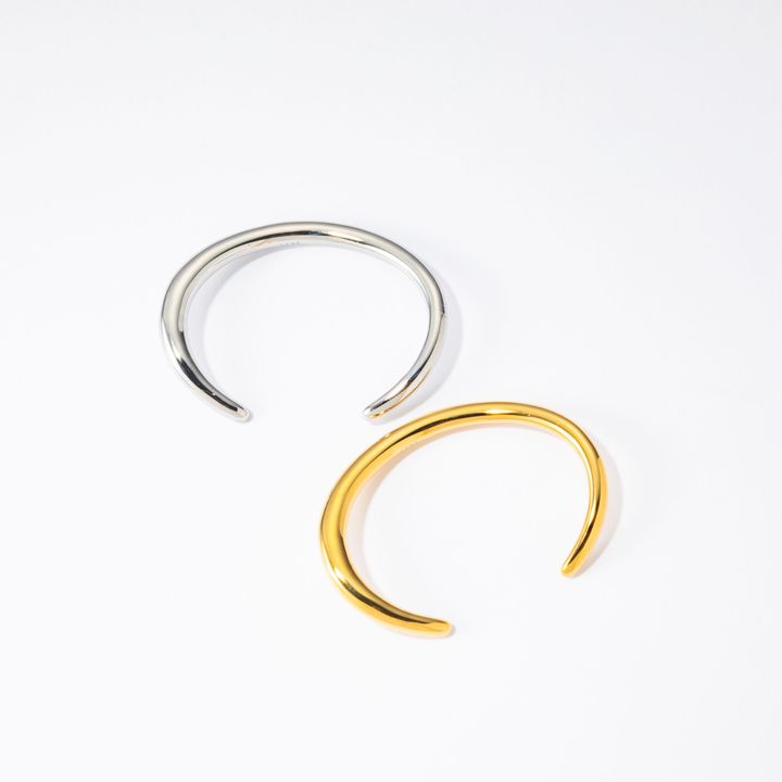夏の素肌に映えるバングルは、ゴールドとシルバーの2カラーで展開。シンプルなコーデにひとつ取り入れても、または両色を重ねづけしてミックススタイルを楽しむのもおすすめ。軽やかなデザインが手首に抜け感をプラスし、暑い季節のおしゃれを格上げしてくれますよ。