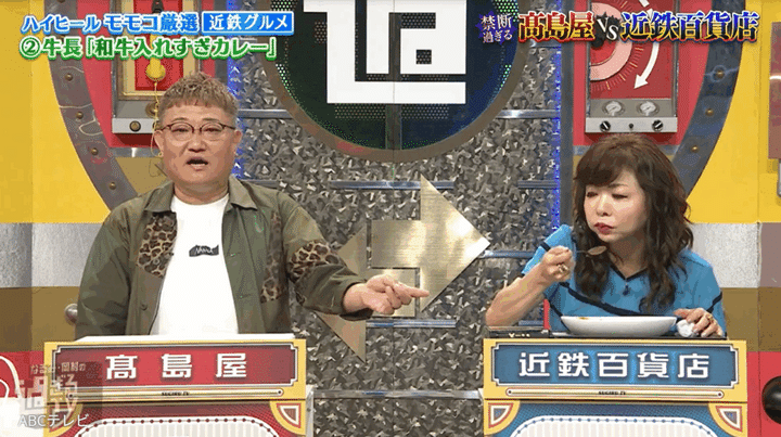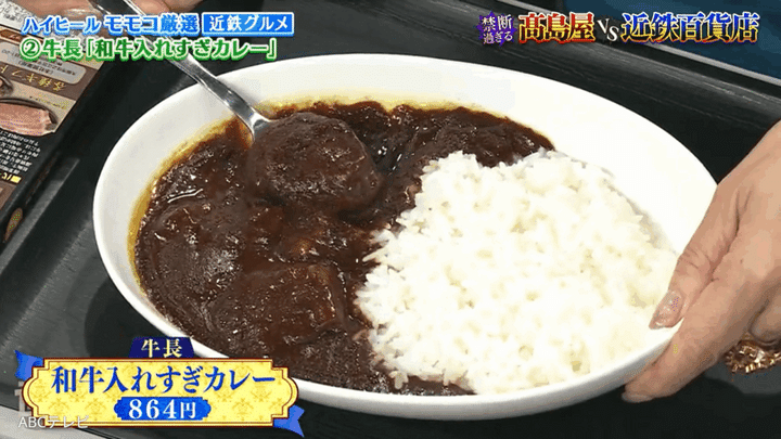さらにモモコは、近鉄百貨店のNo.1商品として、牛肉販売で有名な牛長の「和牛入れすぎカレー」を紹介した。「味もええし肉がえっぐい入ってんねん。ちょっと見て!」と彼女が用意したカレーには、食べ応え満点の肉がゴロゴロ! スタジオ一同が「うわっ!」「おっきい!」「レトルトで!?」などと驚くなかで、モモコはまたもや1人で食べ始め「めちゃくちゃおいしいねん! やめられへんよ!」とアピールし、スタジオに笑いを巻き起こした。