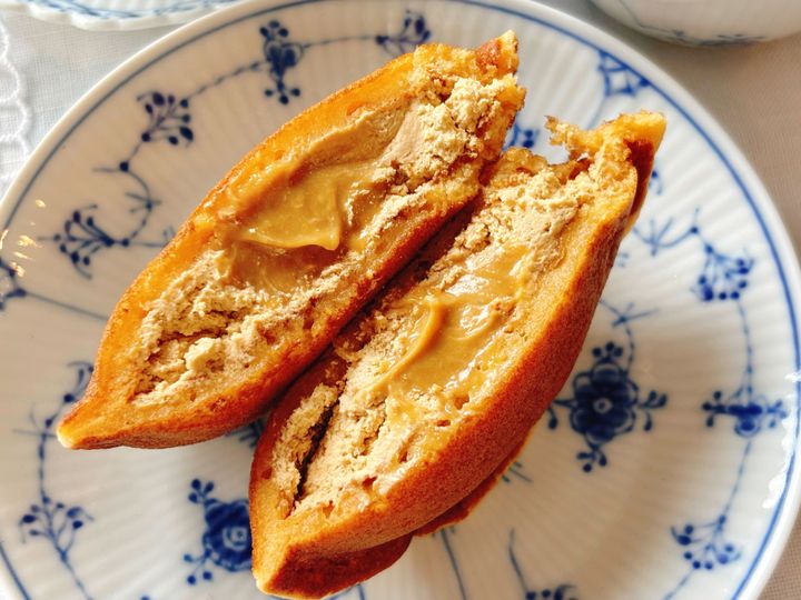 半分に割ると、真ん中の和紅茶ペーストのカスタードがとろけてます…!紅茶の味わいが華やかで強い…!ベルガモット…?お花の香りも感じられるような…?と思うほど、とっても濃厚で口の中に紅茶の味わいが広がります。