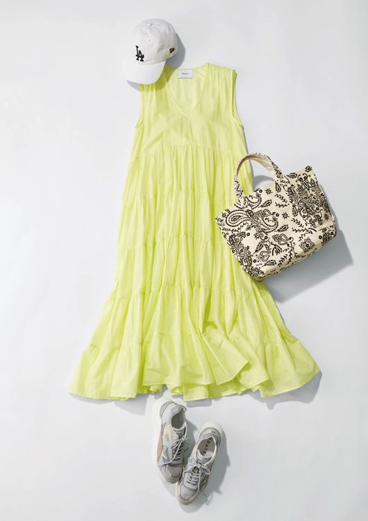 ワンピース¥67,100/マーレット(リトルリーグインク) キャップ¥4,620/ニューエラ バッグ¥26,400/マニプリ スニーカー¥41, 800/デイト(ティースクエア)